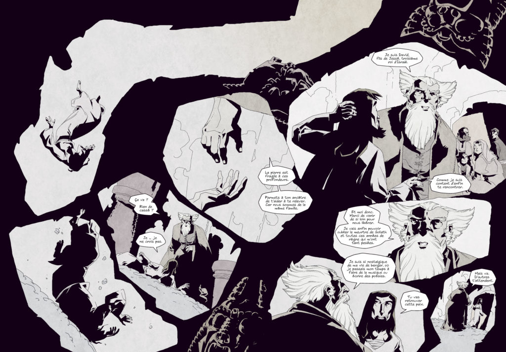 Graphiquement, je devais inventer les enfers, le Shéol. Je me suis inspiré des gravures de Jérôme Bosch et d’éléments byzantins et médiévaux.