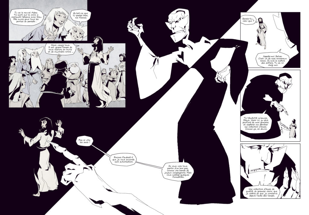 Autant pour Satan, j’avais toute liberté. J’ai même imaginé qu’Abaddon, gardienne des enfers, change de visage à chaque case afin de montrer la perfidie du royaume du mensonge.