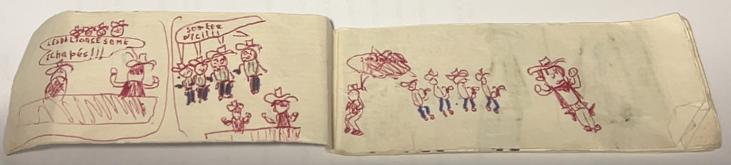 J’ai été biberonné au journal Spirou chaque semaine, dans lequel Les Tuniques bleues étaient déjà une série vedette. Un héritage familial, mon père était lui aussi abonné dans sa jeunesse. À cet âge, chaque dessin, chaque histoire s’imprime de façon indélébile dans la cervelle. Dans le premier numéro que je reçois commence Les Bleus de la marine. Quinze jours plus tard, je découvre un poster des Tuniques Bleues dans les pages de mon magazine ! Donc le 24 octobre 1974, le petit Frédéric, 8 ans au garrot, affiche au-dessus de son lit une scène de bataille, avec un Chesterfield va-t-en guerre qui crie « Ayayayaya! » et un Blutch pétochard qui murmure « aïe aïe aïe aïe… ». J’ai repompé ce gag dans le prochain opus. On va dire que c’est un hommage.