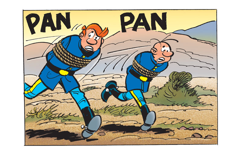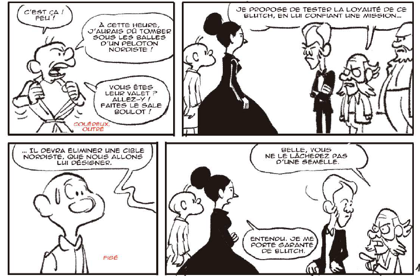 À l’origine, la série a été initiée par l’éditeur, qui venait de perdre Lucky Luke, passé à la concurrence, et qui voulait un nouveau western. On est alors en 1968, on est encore loin des bandes dessinées « à message ». L’objectif, c’est juste de divertir un public familial. Bon, c’est vrai, depuis il y a eu quelques épisodes dans lesquels on trouve un sous-texte relativement engagé, Captain Nepel (1993) brocarde l’extrême droite, Black face (1983) dénonce le racisme… On peut considérer que Blutch l’antimilitariste (ou le couard, selon le point de vue) est la caution anti-guerre de la série. Mais je pense que l’essence des Tuniques bleues, c’est plutôt un conflit lointain, dans le temps et dans l’espace, vu par et pour des Européens, avec un angle parodique, caricaturé et décalé, de la même manière que les Italiens ont traité l’histoire des États-Unis du XIXe siècle avec leurs westerns spaghetti, ou Morris et Goscinny avec Lucky Luke. Ça n’empêche que le côté absurde et vain de la guerre est souvent mis en scène dans la série. Sans pour autant tomber dans un moralisme niais, en mode « mal guerre c’est pas bien », évidemment. C’est important, parce qu’on se situe dans un style semi-réaliste, ce qui est relativement particulier dans la BD franco-belge. On est dans une thématique grave, la guerre, mais avec un parti-pris résolument humoristique. C’est la marque de fabrique de Cauvin, qui parvient à parler de la mort (Pierre Tombal) ou de la maladie (Les Femmes en blanc) avec un ton décalé, et un humour adapté au grand public.
