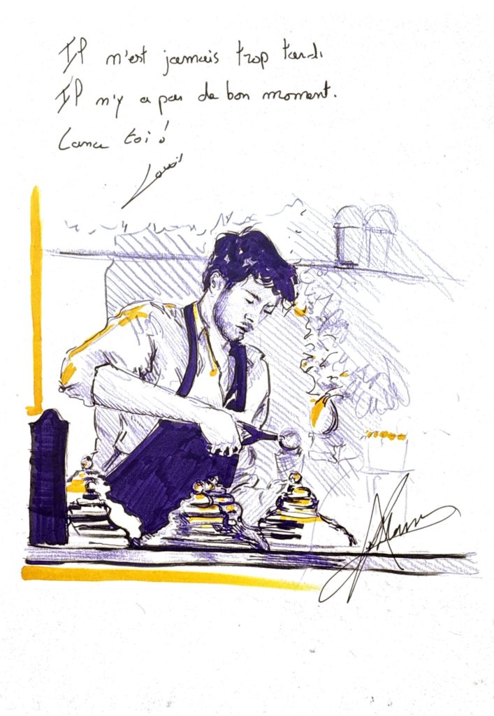 C’était il y a à peine quelques semaines. J’ai des amis qui travaillent au Théâtre de l’européen et ils m’ont prévenu que lors de son spectacle, Léopold demandait si quelqu’un dans le public avait un talent caché et était prêt à monter sur scène. J’ai accepté de venir au spectacle mais j’ai cru que cet appel n’allait pas se faire ce soir-là. Puis, à la toute fin du spectacle, Léopold a posé la question. Mes amis m’ont pointé du doigt et me voilà sur scène. Je n’ai pas eu le temps de stresser (rires) et j’ai fait le portrait de Léopold Lemarchand. Ce fut un beau moment.