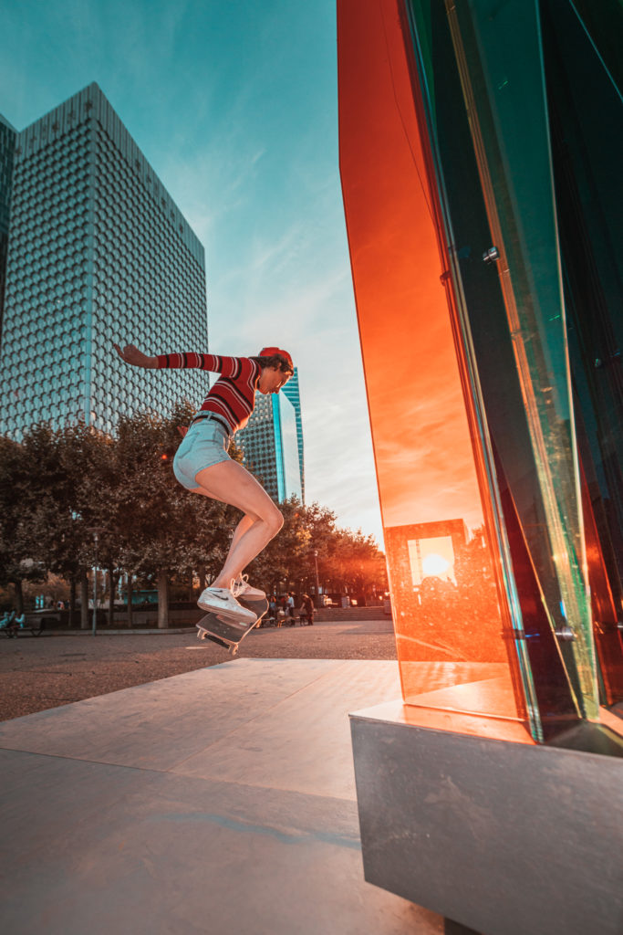 En plus d’avoir été footballeuse, je fais du skate depuis l’adolescence. Rouler me donnait une liberté particulière : on regarde les rues autrement, les trottoirs deviennent des terrains de jeu, les escaliers une possibilité. Et la communauté du skate a quelque chose de très beau, très solidaire.