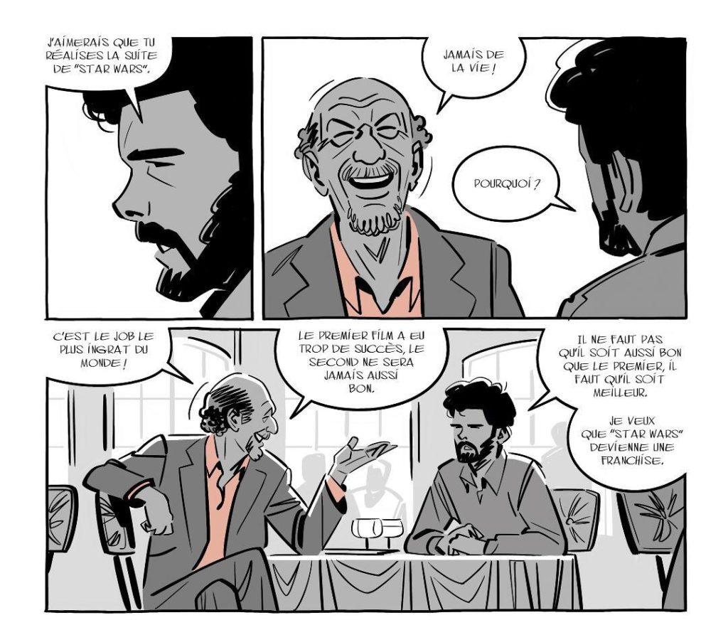 Laurent Hopman : L’écriture du tome 2 était déjà achevée lorsque nous avons appris que George Lucas avait le premier livre entre les mains. Renaud était aussi déjà bien avancé dans le dessin de ce deuxième volume. Quand bien même nous aurions été soumis à une pression supplémentaire, ça n’aurait pas eu d’influence sur la réalisation de l’ouvrage. Mais de manière plus générale, lorsque nous nous sommes lancés dans ce projet, nous savions que certains des protagonistes, dont Lucas, auraient peut-être un jour le livre entre les mains, et il fallait dès le départ faire abstraction de ce fait et se concentrer sur l’objectivité du récit, sans craindre de froisser les susceptibilités et sans chercher à flatter les uns ou les autres.