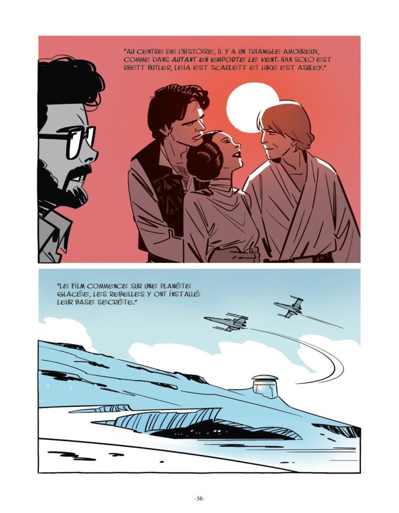Renaud Roche : Je cherche toujours une certaine harmonie dans une page. Au sein d’une case, j’aime mettre en lumière des émotions, des gestes ou bien un objet précis. Certaines couleurs reviennent régulièrement tout au long du récit. Le jaune flamboyant, que l’on retrouve dans le logo Star Wars, était prédominant dans le tome 1. Dès qu’un élément ou une rencontre faisaient basculer la vie de George, j’utilisais cette couleur.