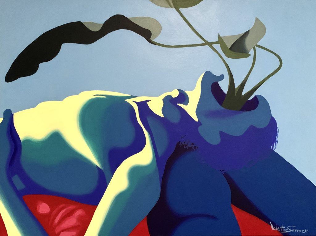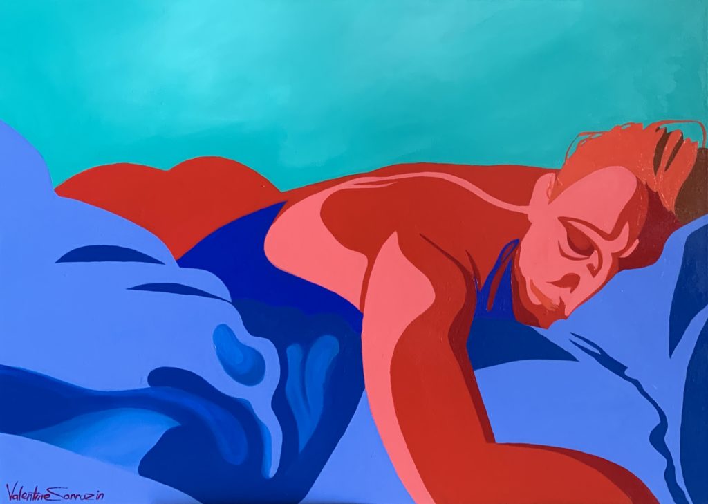 J’ai en fait commencé la peinture lorsque je séjournais dans la région du Verdon. J’y vais tous les étés depuis ma naissance, c’est un lieu qui m’a toujours beaucoup inspiré. Lorsque vous vous promenez, vous pouvez remarquer que la roche peut être orange et les lacs très bleus. Même s’il y a beaucoup de fantaisie dans mon travail, je m’inspire beaucoup de la nature et si elle ne figure pas toujours littéralement sur ma toile, elle en est le systématiquement le catalyseur. Je vis en milieu urbain alors je surcompense peut-être un peu en peignant une nature qui surgit de partout, une chaleur lourde et des corps au repos.