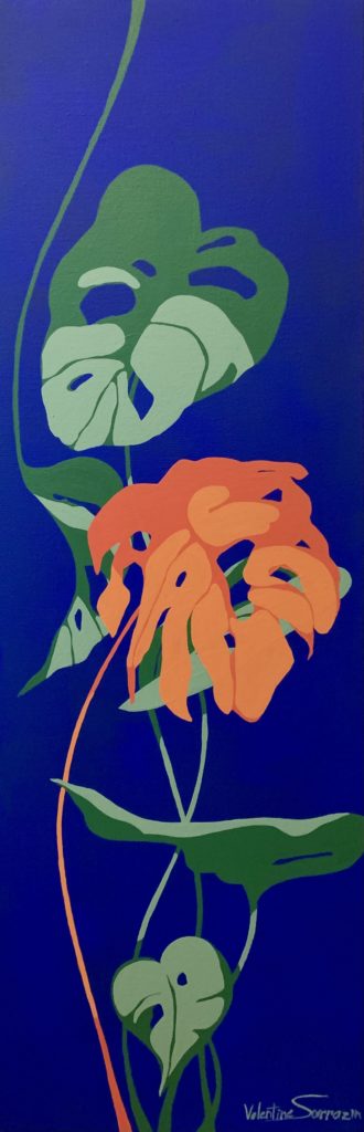 Je travaille essentiellement avec de l’acrylique sur toile, cela implique un travail rapide puisque la peinture sèche très vite. Lorsque je commence une toile, je ne fais pas de maquette, je pose ma composition au pinceau et je place rapidement mes premiers aplats. Il y a une grande part d’imagination et d’improvisation, je n’ai pas de soucis à recouvrir une partie du tableau si elle ne me plait pas. Je m’adapte finalement à la couleur d’une fleur puis j’harmonise. Généralement, je vais placer ma première couleur puis je travaille avec sa complémentaire, puis une déclinaison de la première couleur et ainsi de suite. Je ne souhaite jamais d’œuvres dites froides. Je travaille dans une pièce qui manque de lumière alors je choisis toujours des couleurs chaudes et intenses – même le bleu.