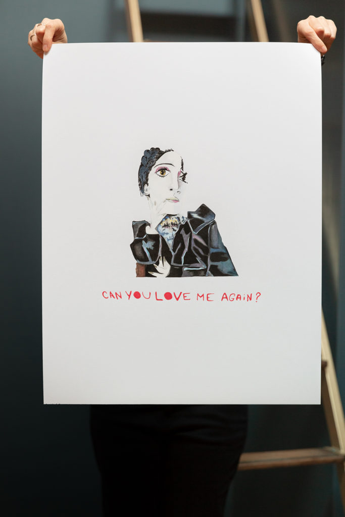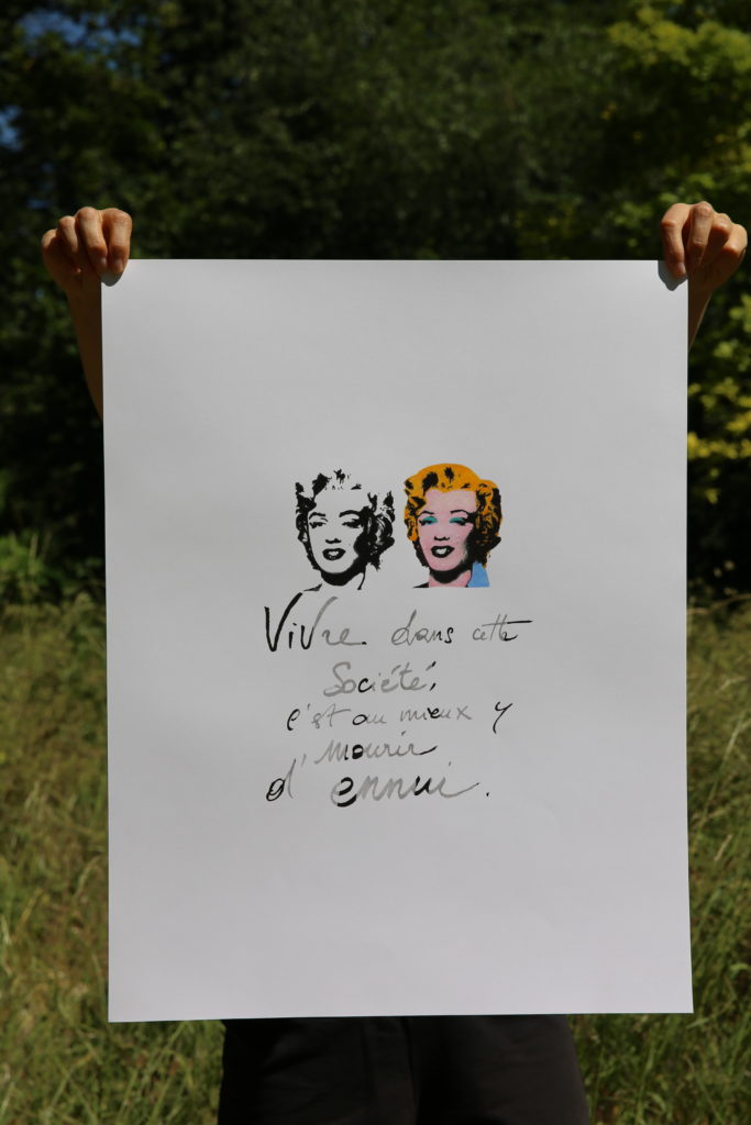 Non. Je suis entrée aux Beaux-Arts avec un dossier constitué essentiellement de photographies et de peintures sur papier. En première année, nous avions différents cours obligatoires : dessin, volume, graphisme, gravure, couleur, édition, vidéo, photo… Cela permet d’expérimenter plein de choses. J’ai ensuite essayé de réaliser quelques vidéos mais j’ai passé le premier diplôme, le DNAP en présentant un ensemble de sculptures. Ensuite, j’ai travaillé plutôt sur des projets d’expositions, réelles et imaginaires, qui ont failli me faire rater le deuxième diplôme, le DNSEP, avant de poursuivre avec une formation curatoriale à l’École de Magasin à Grenoble. J’ai commencé à dessiner bien plus tard, d’abord des croquis pour expliquer des œuvres dans des dissertations d’Histoire de l’art, et ensuite dans mes propres dessins pour lesquels je reproduis des morceaux d’œuvres que j’apparie avec des textes-slogans.