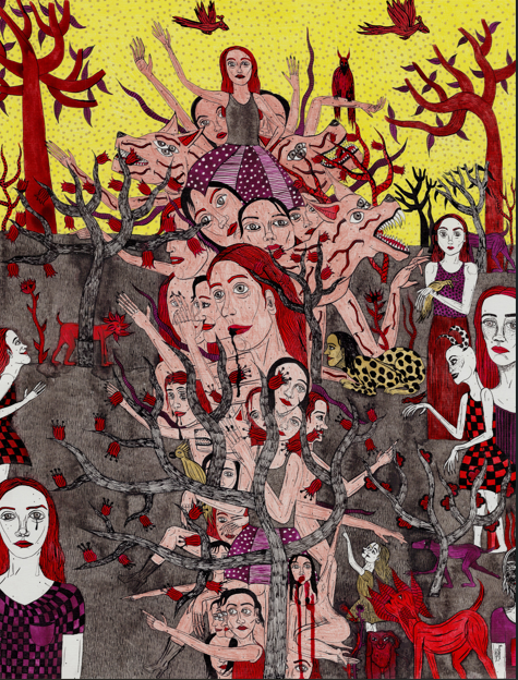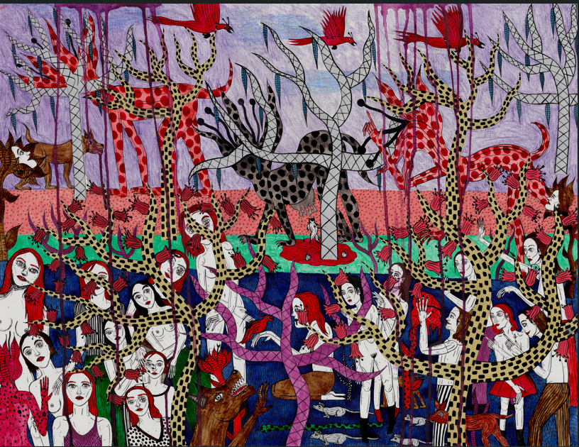 Quand j’étais ado, mes parents me disaient toujours que ce que je faisais était glauque et sombre. J’avais beau mettre mille couleurs, ils trouvaient toujours cela sombre. Aujourd’hui, ça me fait rire un peu. J’aime quand le maximum de couleurs se mélange, quand il y a parfois trop d’informations, que ça peut faire « mal aux yeux », j’aime bien. Mais je fais aussi souvent des dessins juste en noir et blanc à l’encre de Chine ou en rouge et noir, souvent en rapport avec mon projet de musique Rouge Renarde.