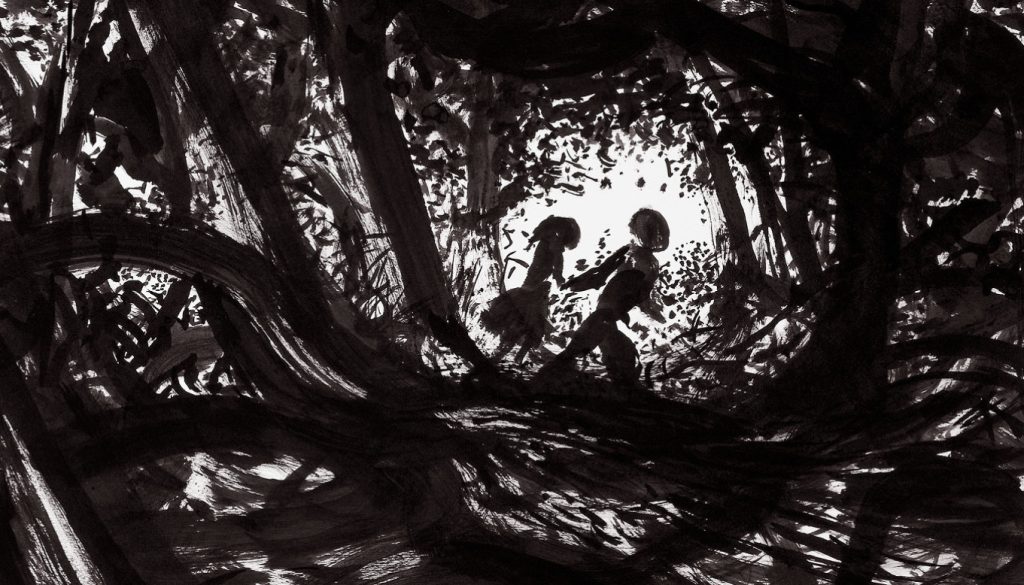 L’adaptation est venue après un voyage en Patagonie. Je me suis mis en tête de faire une recherche graphique sur les forêts. Je voulais créer une profondeur noire de cet espace naturel. Cette recherche qui a duré plus de 3 ans a été avant tout picturale. Il n’y avait au départ aucune narration. Je voulais raconter librement l’histoire d’une forêt.