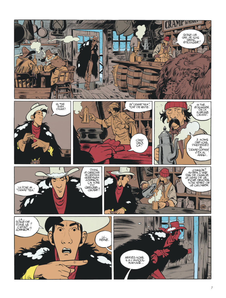 « La Longue marche de Lucky Luke » fait écho aux « Dalton dans le blizzard » (1963) – Seul album qui se déroule dans la neige. Les frères Dalton sont d’ailleurs habillés des mêmes canadiennes grises. Je me suis également inspiré d’ « A l’ombre des derricks » (1962). A ma connaissance, c’est le seul album dans lequel Lucky Luke ne chante pas à la fin. Il se sauve à cause de l’odeur et l’aspect immonde du pétrole répandu dans le livre. C’est un épisode conclu de façon écologique.