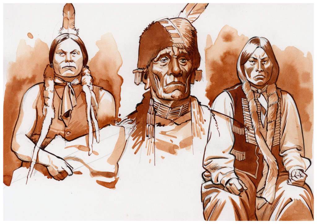 La Longue marche est également le titre d’un album de Blueberry (1980), mais il s’agit surtout de faire écho à un des épisodes tragiques de l’Histoire des peuples amérindiens. Suite à la Bataille de Little Big Horn en 1876, Cheyennes et Sioux ont fui vers le Canada, lors d’une longue marche éprouvante. « La Longue marche de Lucky Luke » donne la part belle aux peuples autochtones. Enfant, j’avais coutume de lire leurs textes, présentés alors de façon condescendante comme de la poésie. Ces écrits nous prévenaient des catastrophes environnementales, ils résonnent aujourd’hui encore plus fort. Nous aurions dû les écouter. La scène où Lucky Luke est attaché au poteau fait référence à cet aspect. Sauver cet enfant c’est aussi sauver la forêt.